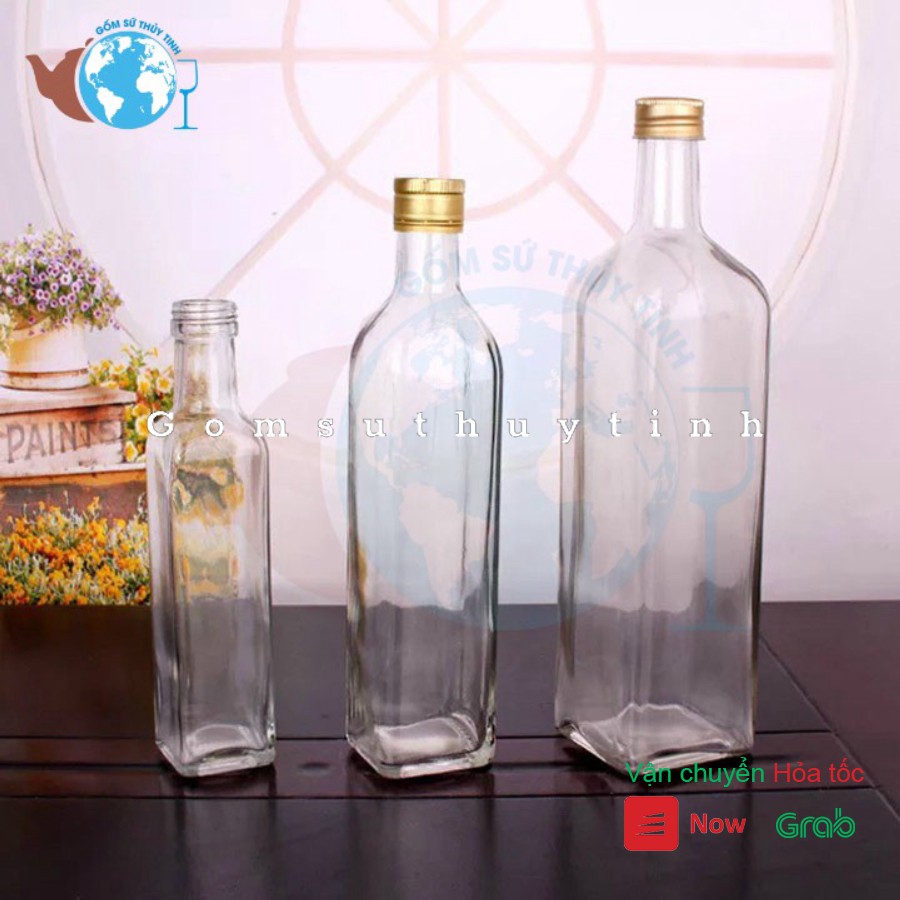 Chai thủy tinh dùng đựng nước để tủ lạnh, có thể công ty,cửa hàng dùng đựng dung dịch lỏng in dán logo riêng,..., dùng đựng dung dịch lỏng trong nhà bếp,...