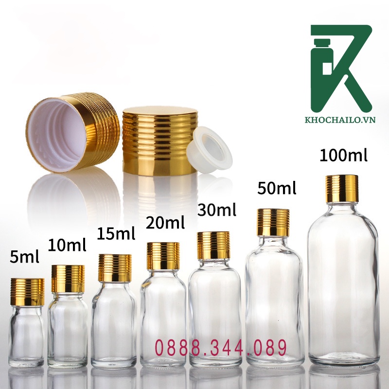 Chai thủy tinh trắng trong nắp vặn xoáy vàng 5ml,10ml,15ml,20ml,30ml,50ml,100ml