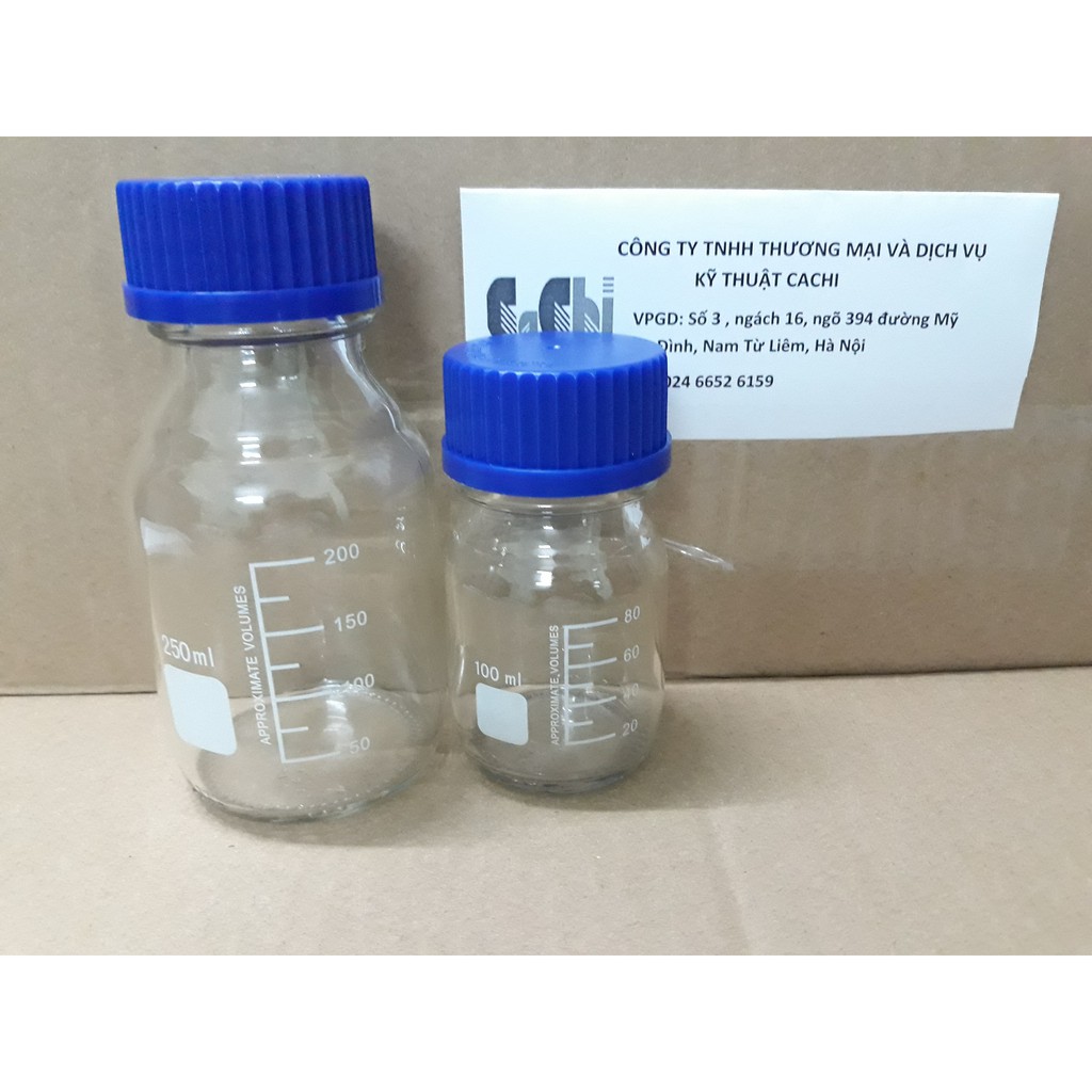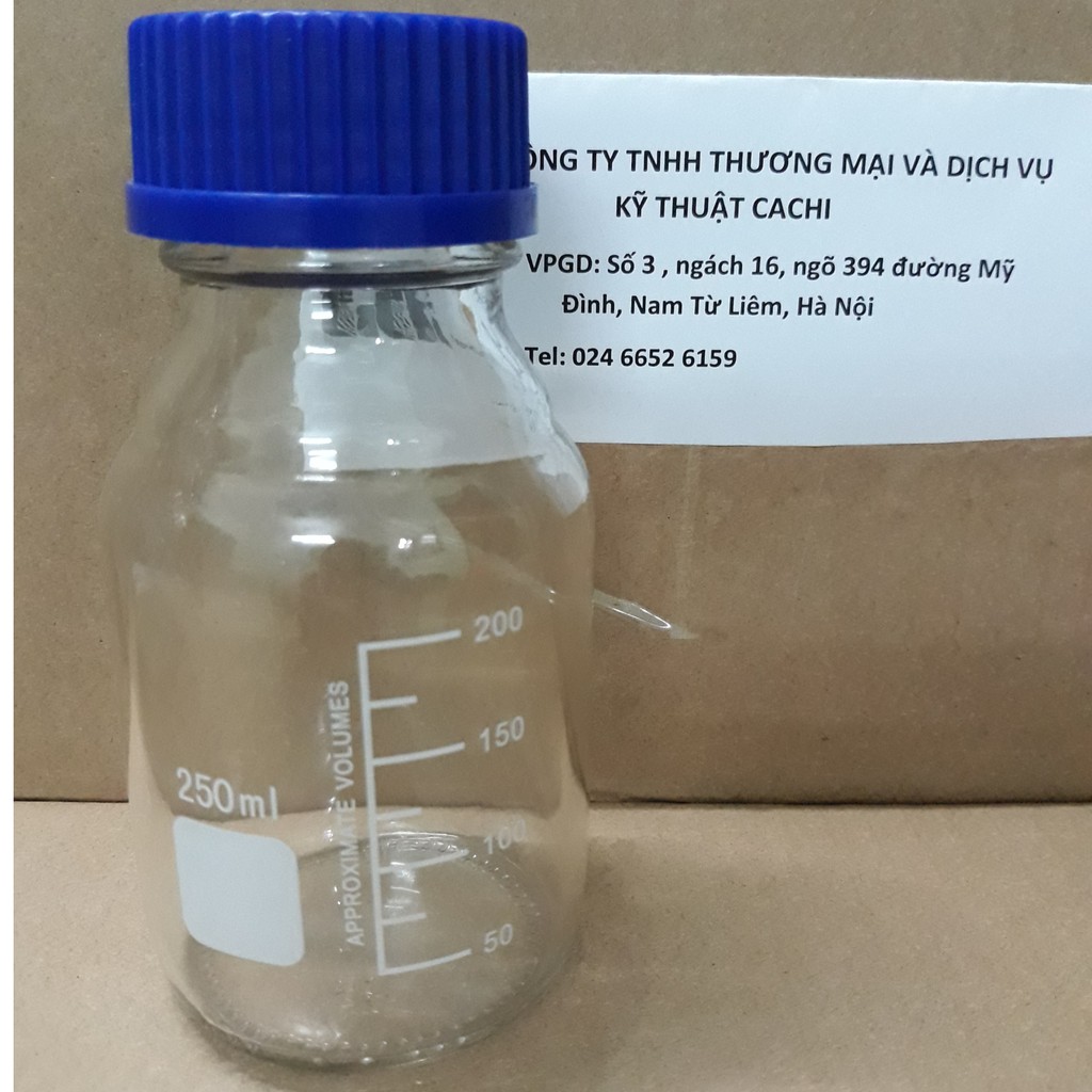 Tên sản phẩm: Chai thủy tinh trung tính 250mlCông dụng: dùng cho phòng thí nghiệm, xét nghiệm, đo thể tích chất lỏng, đựng hóa chất,…