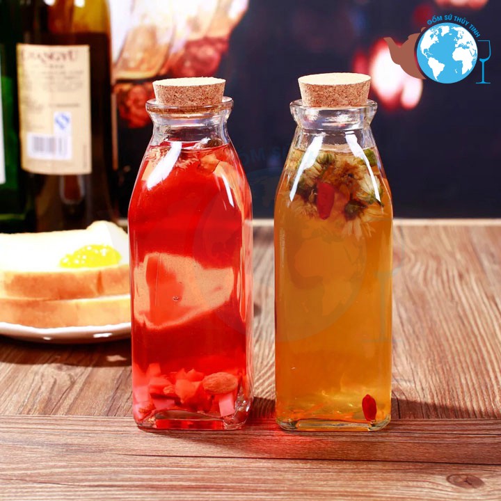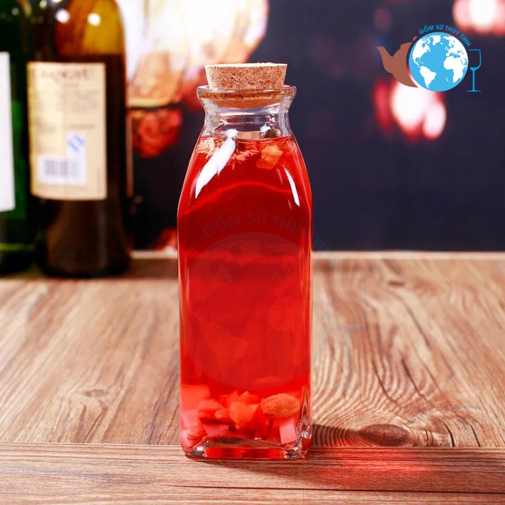 Chai thủy tinh vuông 350ml nút bần-- Chai thủy tinh vuông 350ml nút bần được làm từ thủy tinh cao cấp. Chuyên được sử dụng để đựng các loại nước giải khát, nước ép, cho bạn tận hưởng trọn vẹ hương vị thơm ngon và tươi mát của nước ép.