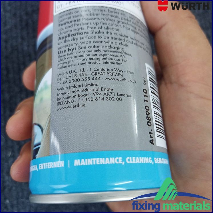 Chai xịt bảo dưỡng ron cao su Wurth Rubber Care 300mlSản phẩm dùng để bảo vệ lốp xe, thảm sàn cao su, lót đệm, đệm cao su, ron kính xe,…bảo dưỡng các thành phần cao su trên xe ô tô và duy trì độ đàn hồi, chống nứt, chống bạc màu và bảo vệ trước tác động của môi trường. Các chi tiết như ron cửa, ron kính xe, vòng đệm cửa, lá lúa gạt nước,…