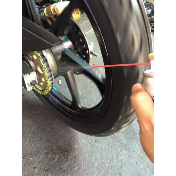 - Lắc đều chai, xịt Chain Lube lên đều trên sên từ khoảng cách 10-20cm. Nên chờ khoảng 10 phút sau khi xịt mới chạy xe.