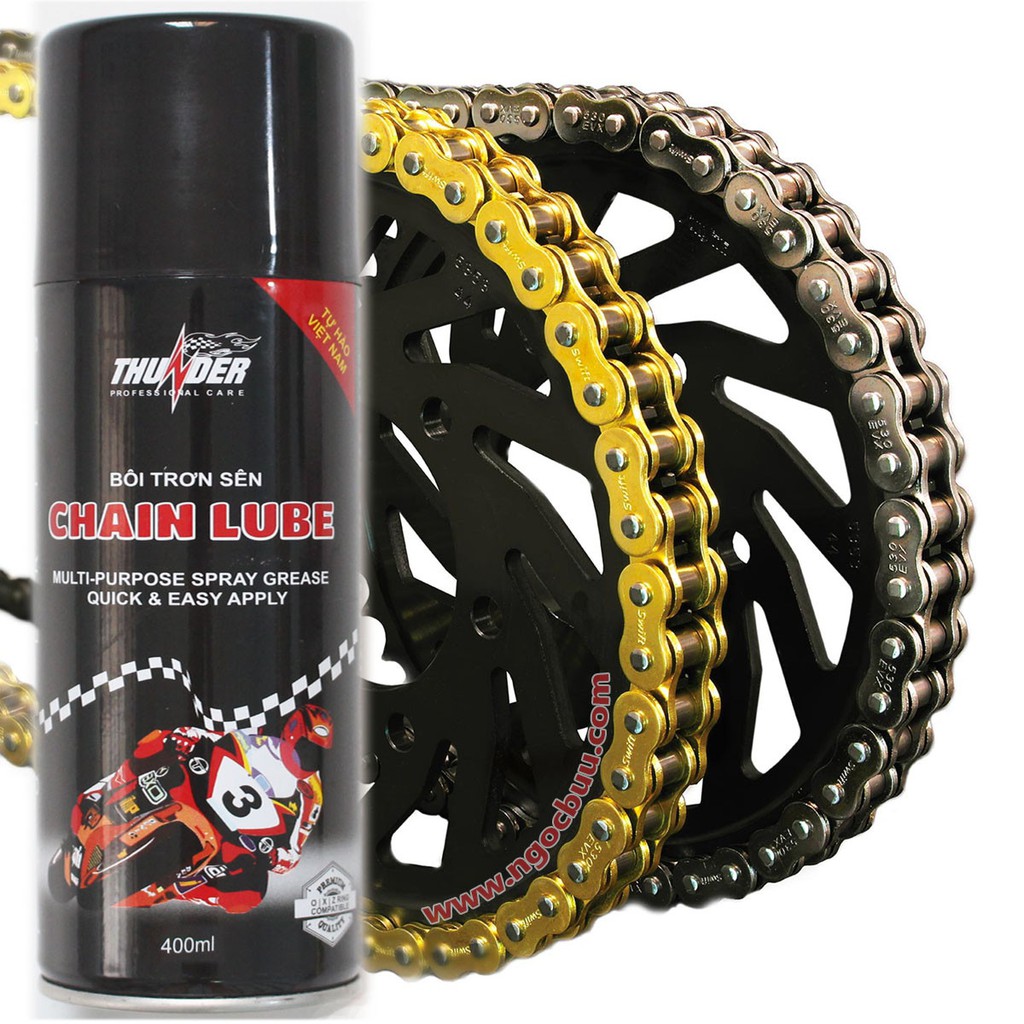 - Lắc đề chai xịt Thunder Lube 200ml, rồi xịt trực tiếp lên bề mặt sên ( giữa các con lăn và các mắt nối). Vừa xịt vừa quay bánh để dầu được bám đều lên sên.