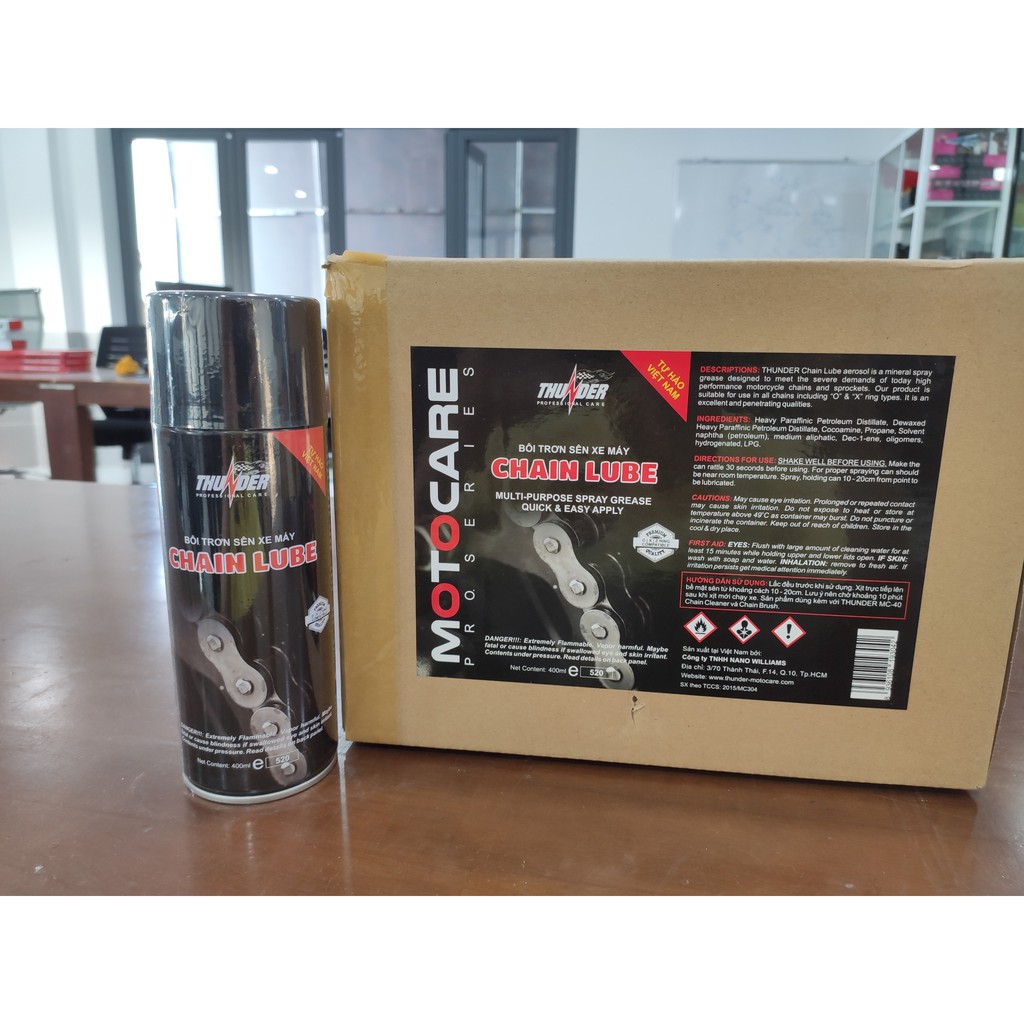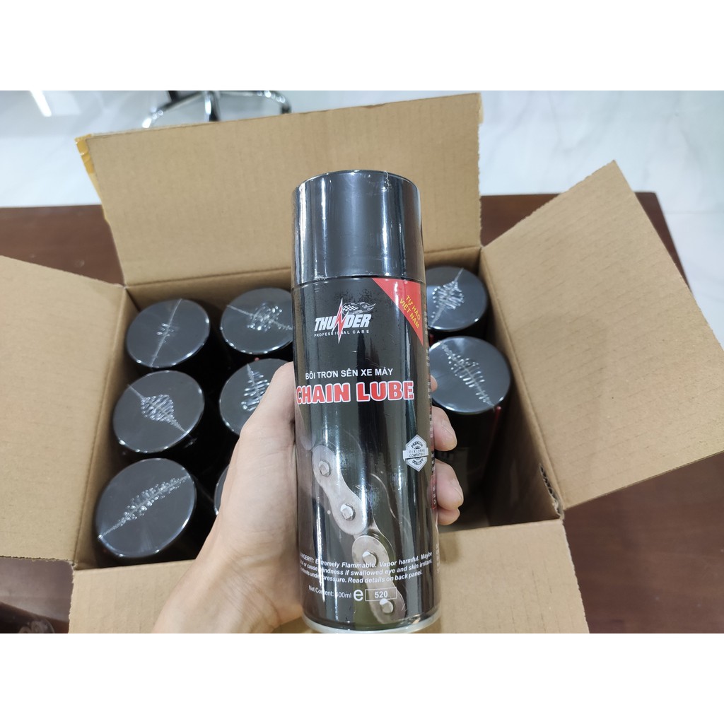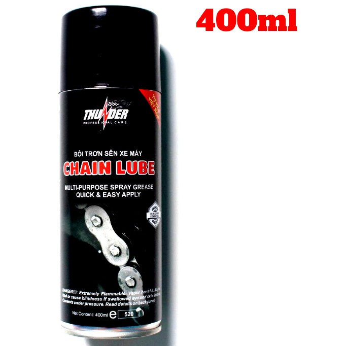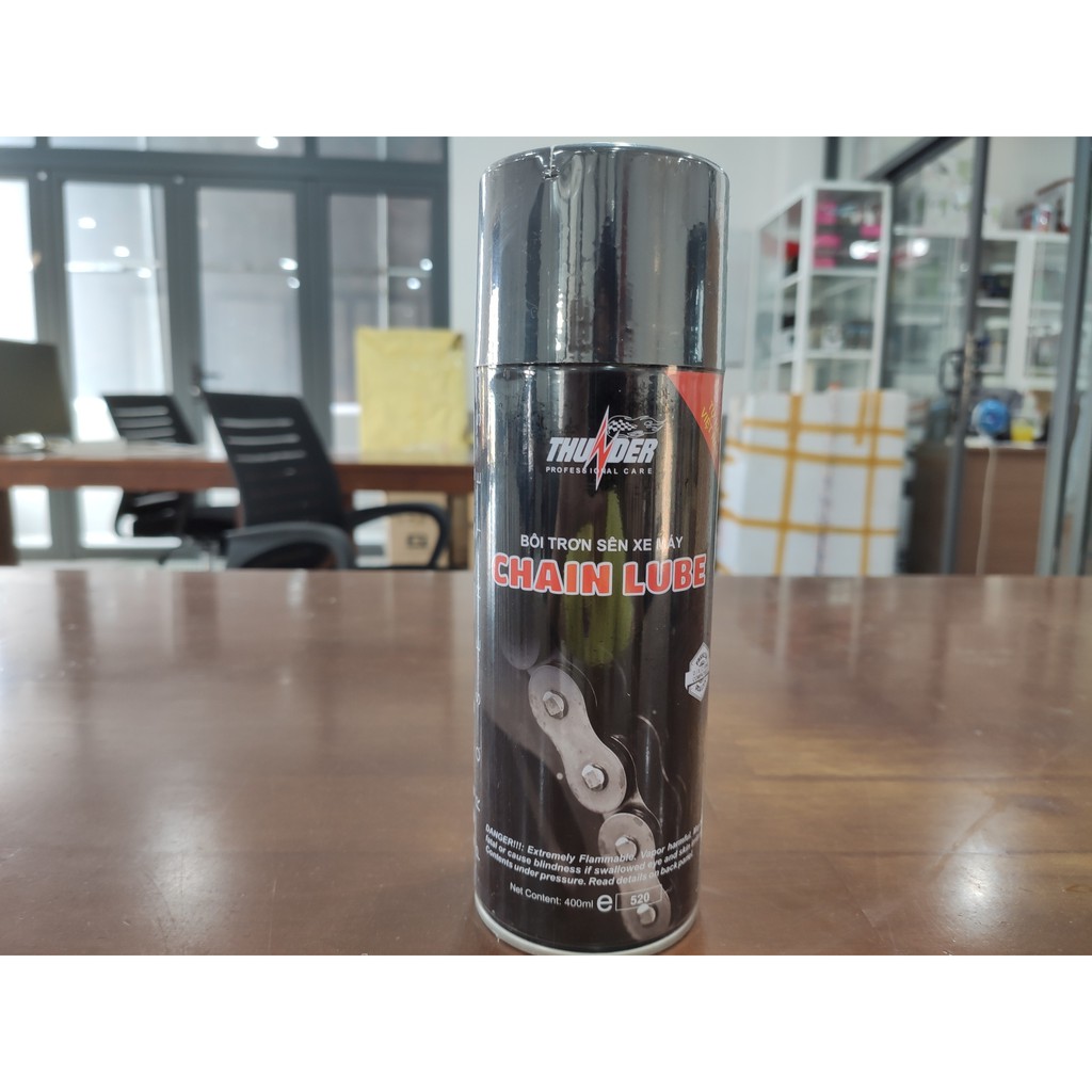 Chai Xịt Bôi Trơn Dưỡng Sên Thunder Chain Lube 400mlChai xịt bôi trơn sên Thunder chain lube (400ml) là sản phẩm hoàn hảo để giúp chiếc xe của bạn duy trì hiệu năng tối đa, bảo dưỡng sên, tránh mài mòn cơ học, giúp sên bền hơn.