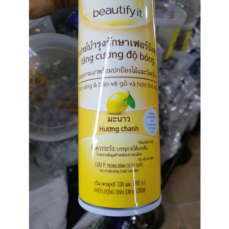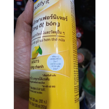 Công dụng Giúp loại bỏ bụi, làm sạch, chăm sóc, bảo vệ đồ gỗ và nội thất sáng bóng, đẹp như mới cùng hương thơm tươi mát.