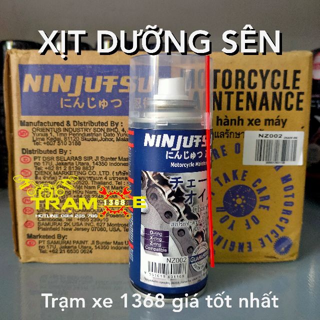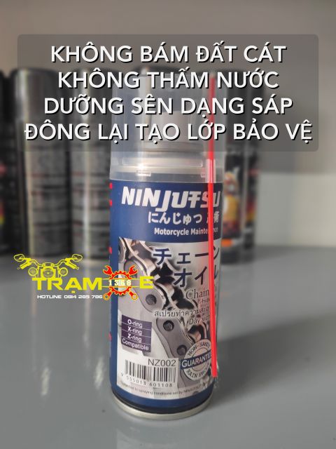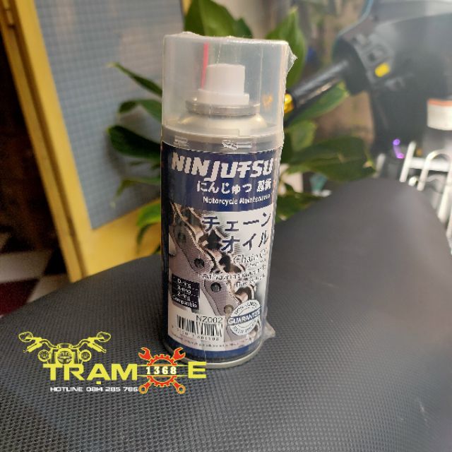 NINJUTSU NZ002 – Chai dầu xích chuyên dùng cho xe máy. Dung dịch bôi trơn nhông xích xe máy NINJUTSU NZ002 sẽ giúp xe chạy mát hơn, mượt mà hơn, êm hơn và kéo dài độ bền xích và nhông xe máy, mô tô