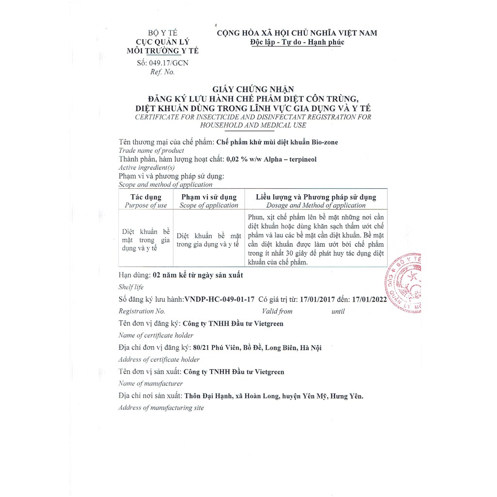 Sản phẩm đã đăng kí bộ Y tế số VNDP-HC-049-01-17