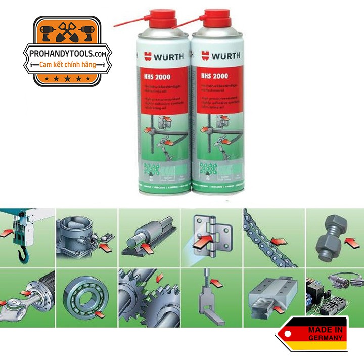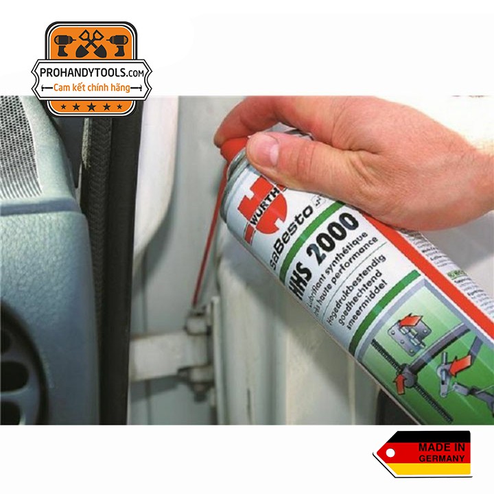 Chai mỡ bò nước dạng xịt Wurth HHS 2000 với công thức đặc biệt bôi trơn tốt hiệu quả cao, còn chịu được rung động, chịu nhiệt và chịu được áp lực cao. Dùng cho việc bôi trơn đa dụng và cả trong các trường hợp yêu cầu khắc nghiệt như: chống ma sát cho khớp nối, bản lề, cần lùi, khóa đẩy, kéo kết cuối, bánh xích, kệ răng, bánh răng mở, rãnh trượt, trục quay, các chi tiết tàu thuyền, chi tiết truyền động ma sát và nhiệt độ cao.Khả năng bôi trơn và bảo vệ chống mài bòn cực tốt.