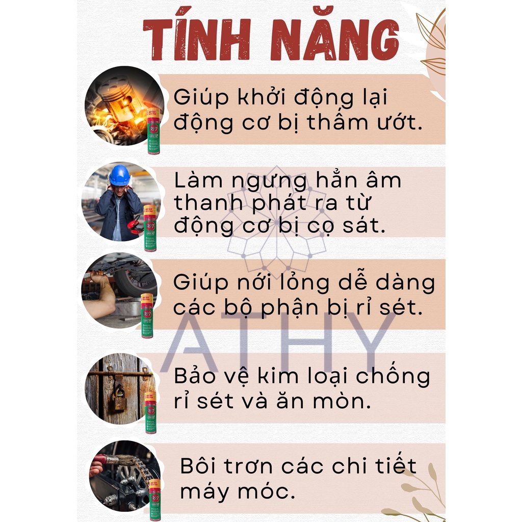 Chất bôi trơn với công thức được cải tiến giúp thấm sau và bôi trơn: Những bộ phận kim loại đã rỉ sét, bu lông và đai ốc, ổ khóa, khóa kéo, dụng cụ, bánh răng.