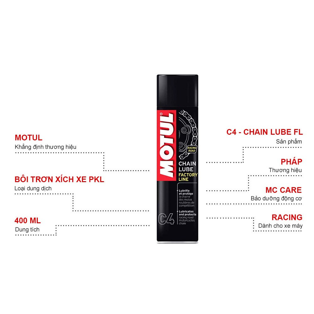 _Chai xịt bôi trơn, bảo dưỡng sên xích xe máy, mô tô PKL Motul C4, chai 400ml được pha chế đặc biệt và tạo một lớp mỏng bám dính vào bề mặt dây xích xe máy, bảo vệ chống mòn dây xích và bánh răng. Đặc biệt khuyên dùng đối với xe máy phân khối lớn chạy trong điều kiện cực khó, chịu ma sát và nhiệt độ cao._Dầu bôi trơn sên Motul C4 là sản phẩm bôi trơn liên kết chắc chắn. Dầu bôi trơn sên Motul C4 là sản phẩm bôi trơn dây sên xe máy rất tốt, đặc biệt cho dòng xe phân khối lớn. Dầu bôi trơn sên Motul C4 giúp xe vận hành êm và gia tăng tốc độ nhanh chóng.