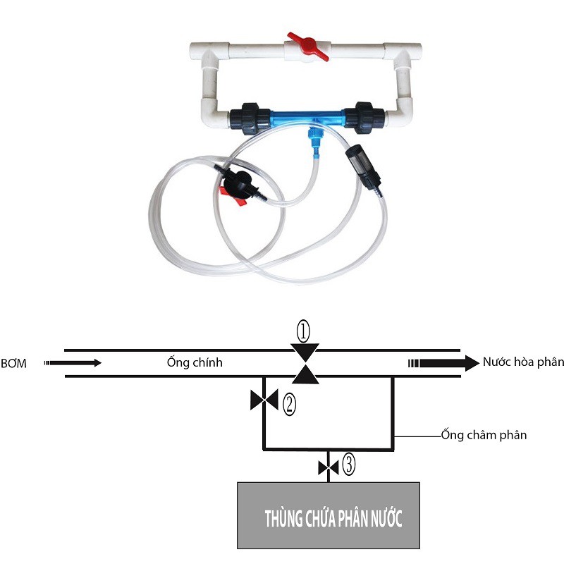 - Phân, thuốc, hoặc chất dinh dưỡng được hút lên qua đường ống dẫn, sau đó hòa chung cùng hệ thống nước tưới khi có sự khác biệt áp suất giữa nguồn nước phía trước và sau của điểm hội tụ.