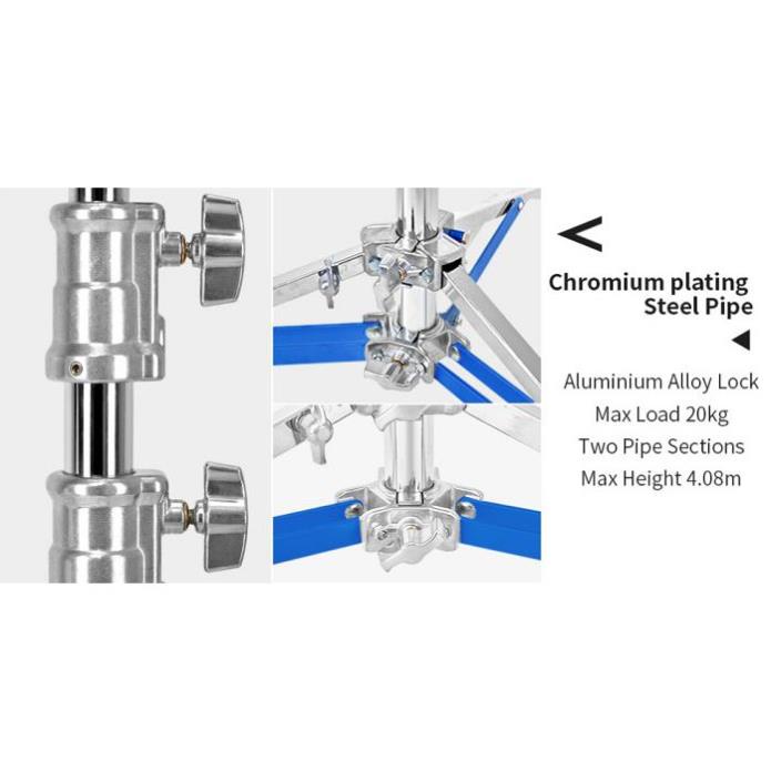 Chân boom Jinbei M6 2in1 chuyên hỗ trợ cho các đèn chiếu sáng lớn hơn và các thiết lập chiếu sáng, giá đỡ đèn thép 2 trong 1 M6 của Jinbei hỗ trợ các loại đèn và phụ kiện nặng đến 20kg với chiều cao tối đa 408 cm khi được sử dụng như một giá đỡ đèn thông thường. Với M6 Jinbei bạn có thể thực hiện nhiều tùy chọn chiếu sáng khác nhau với đèn flash studio, đầu đèn flash, ánh sáng liên tục LED hoặc đèn chiếu điểm. Boom M6 Jinbei đường kính sải rộng chân lên tới 1.2 m cho độ vững chắc khi sử dụng softbox lớn, khóa chịu lực tốt đảm bảo chắc chắn khi thiết bị được gắn kết.THÔNG SỐ KỸ THUẬT:
