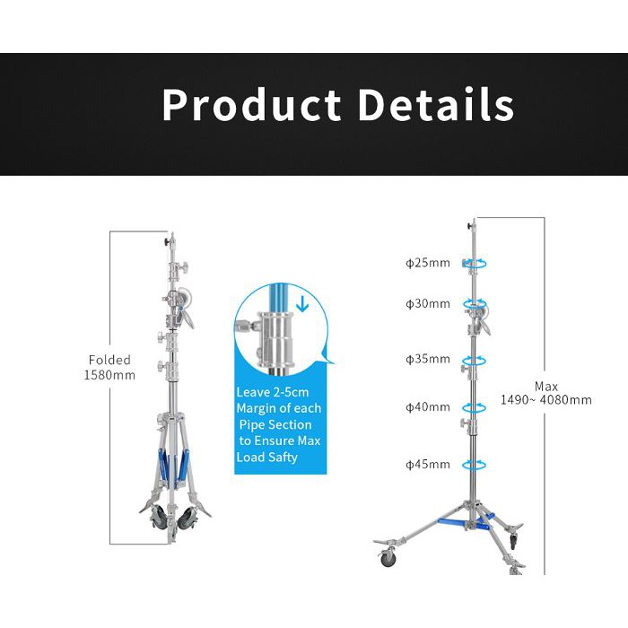 Chân boom Jinbei M6 2in1 chuyên hỗ trợ cho các đèn chiếu sáng lớn hơn và các thiết lập chiếu sáng, giá đỡ đèn thép 2 trong 1 M6 của Jinbei hỗ trợ các loại đèn và phụ kiện nặng đến 20kg với chiều cao tối đa 408 cm khi được sử dụng như một giá đỡ đèn thông thường. Với M6 Jinbei bạn có thể thực hiện nhiều tùy chọn chiếu sáng khác nhau với đèn flash studio, đầu đèn flash, ánh sáng liên tục LED hoặc đèn chiếu điểm. Boom M6 Jinbei đường kính sải rộng chân lên tới 1.2 m cho độ vững chắc khi sử dụng softbox lớn, khóa chịu lực tốt đảm bảo chắc chắn khi thiết bị được gắn kết.THÔNG SỐ KỸ THUẬT: