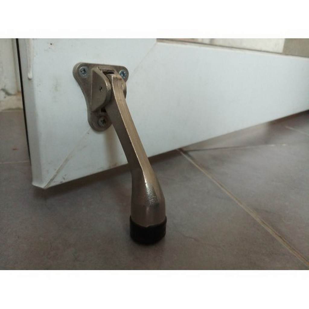 Cấu tạo và cách lắp đặt chặn cửa móng ngựa: Rất đơn giản, khoan / bắt vít vào vị trí được xác định sau đó dùng chân đạp xuống thì nó có tác dụng dừng cửa, gạt nó lên thì cửa hoạt động bình thường.