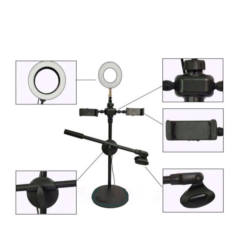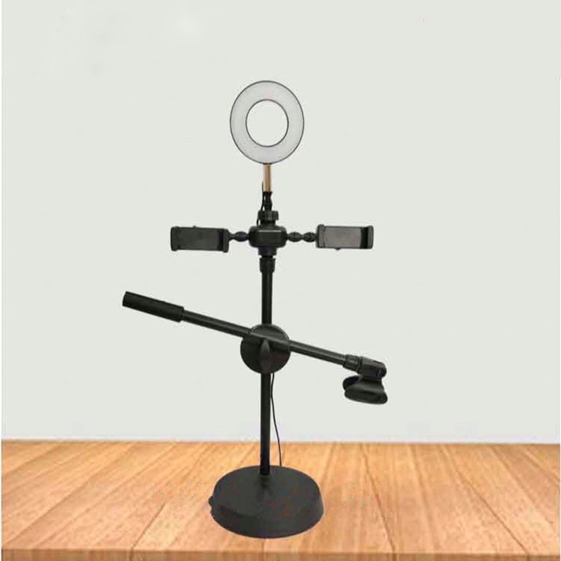 Chân đế kẹp 2 điện thoại, giá đỡ micro kèm đèn LED siêu sáng dùng cho live stream chuyên nghiệpXuất xứ: Trung Quốc