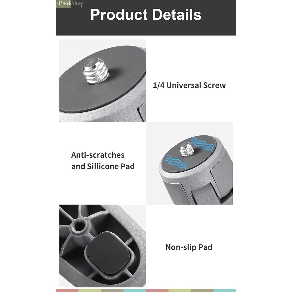 - Ren xoáy chuẩn 1/4-20 cho phép tương thích với nhiều loại gá kẹp điện thoại, webcam, máy ảnh loại nhỏ.