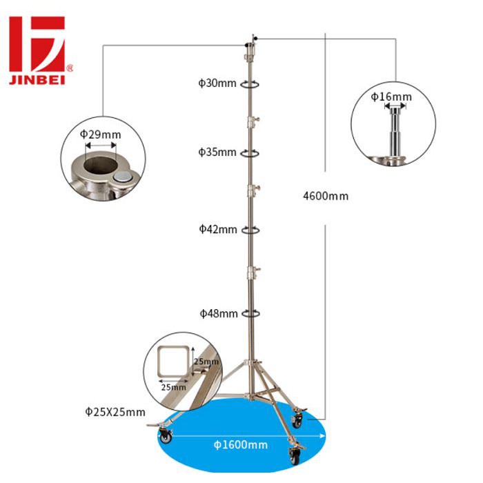 Chân đèn Jinbei JB-4200 Studio Light Stand được sản xuất bằng thép chất lượng cao, đường kính ống lớn giúp cho nó có khả năng chịu tải cao lên đến 20kg. Trụ ống lồng bốn phần, chiều cao tối đa đạt 4,6 mét tích hợp đệm lò xo chống rung lắc hiệu quả. Chân JB-4200 được thiết kế có thể thu vào, có thể áp dụng cho các mặt đất không bằng phẳng hoặc cầu thang, bậc tam cấp rất linh hoạt và cơ động. Dưới chân có 3 bánh xe đa năng chuyên nghiệp loại lớn có phanh rất tiện lợi khi di chuyển. Chân boom JB-4200 chính hãng Jinbei chuyên nghiệp rất phù hợp với các loại đèn flash, đèn quay phim và truyền hình chuyên nghiệp.THÔNG SỐ KỸ THUẬT: