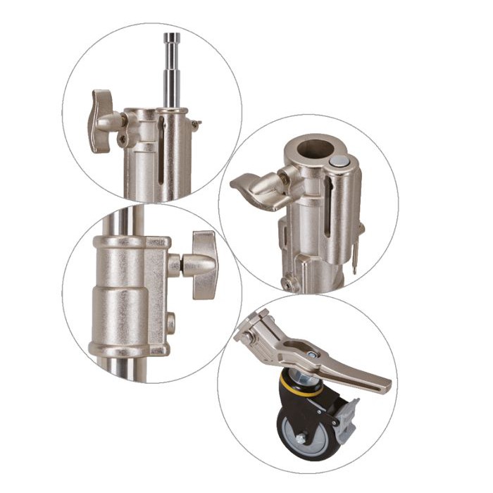 Chân đèn Jinbei JB-4200 Studio Light Stand được sản xuất bằng thép chất lượng cao, đường kính ống lớn giúp cho nó có khả năng chịu tải cao lên đến 20kg. Trụ ống lồng bốn phần, chiều cao tối đa đạt 4,6 mét tích hợp đệm lò xo chống rung lắc hiệu quả. Chân JB-4200 được thiết kế có thể thu vào, có thể áp dụng cho các mặt đất không bằng phẳng hoặc cầu thang, bậc tam cấp rất linh hoạt và cơ động. Dưới chân có 3 bánh xe đa năng chuyên nghiệp loại lớn có phanh rất tiện lợi khi di chuyển. Chân boom JB-4200 chính hãng Jinbei chuyên nghiệp rất phù hợp với các loại đèn flash, đèn quay phim và truyền hình chuyên nghiệp.THÔNG SỐ KỸ THUẬT: