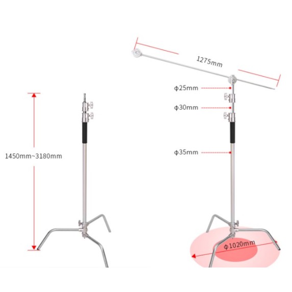 Chân đèn Light Stand C inox cao cấp 338 cm chụi tải 20kg. Đây là dòng cao cấp dành cho việc treo đỡ nặng như flash , beautydisk, softbox khổ lớn …