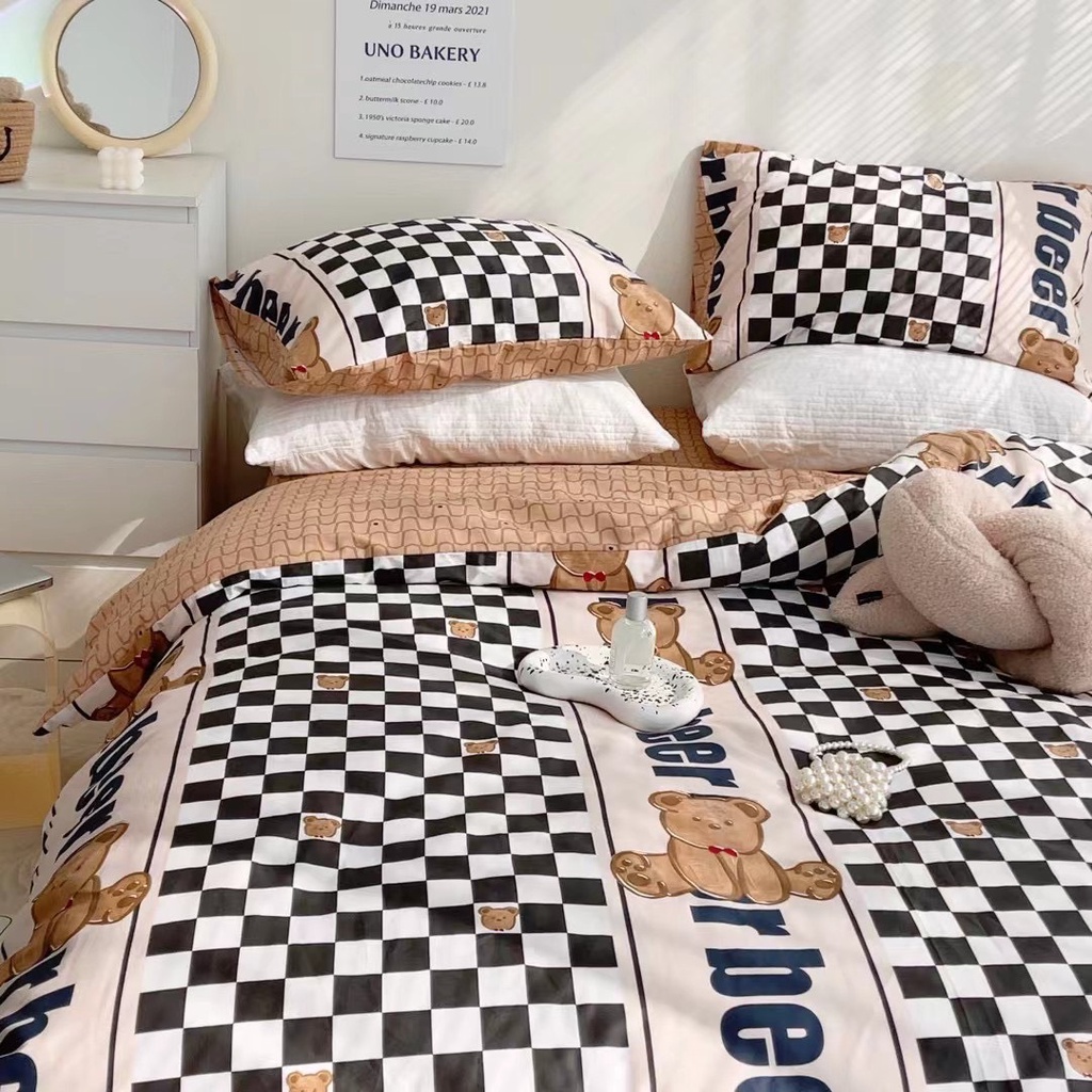 Giới thiệu bộ chăn ga gối cotton living nhập khẩu lonaabedding họa tiết kẻ ô vuômg tắng đen gấu bear ( full size)