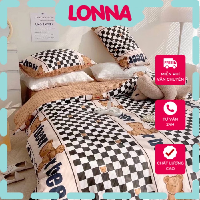 bộ chăn ga gối cotton living nhập khẩu lonaabedding họa tiết kẻ ô vuômg tắng đen gấu bear ( full size)