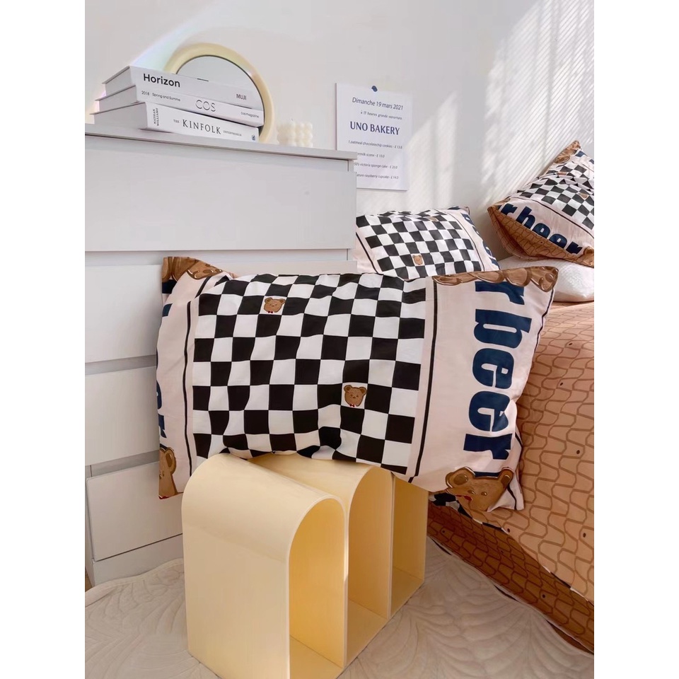 Nhà cửa & Đời sống > Chăn ga gối nệm > Khác || bộ chăn ga gối cotton living nhập khẩu lonaabedding họa tiết kẻ ô vuômg tắng đen gấu bear ( full size)Còn hàng