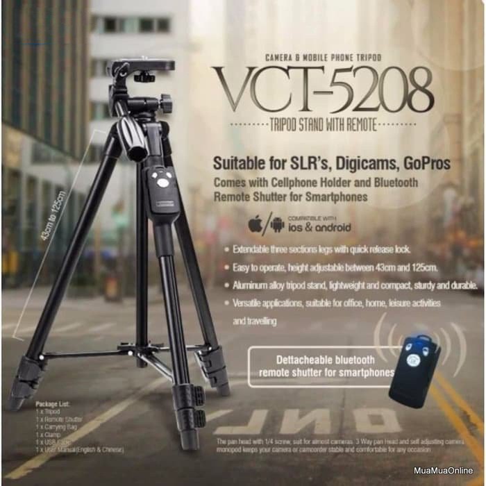 #giadodienthoai #tripod #changiado #bluetoothTripod VCT-5208 sở hữu kích thước nhỏ gọn, tiện lợi. Vật liệu thép mạ tĩnh điện siêu chắc chắn, giúp bạn dễ dàng mang theo người trong những chuyến đi xa.
