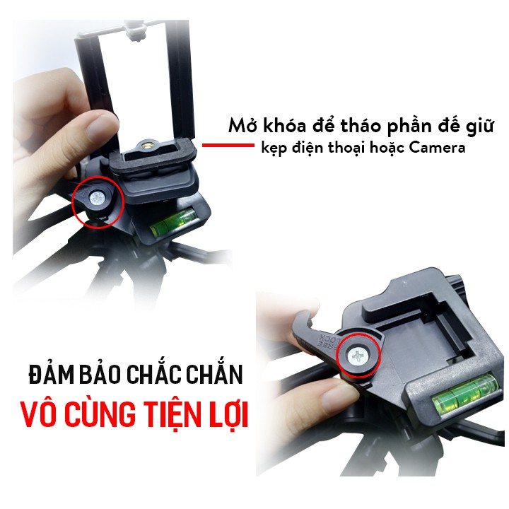 Thiết kế chắc chắn với độ cao lên đến 140cm. Đặc biệt, phần gắn kẹp điện thoại và camera được thiết kế tiện lợi bạn không cần phải cúi người để gắn camera vào đế ốc vặn mà nó sẽ được thiết kế thành 2 phần có thể tách ra nhờ vào phần khóa.