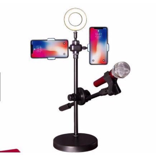 chân 5 trong 1 gồm có chân đế 2 kẹp điện thoại 1 đèn led 1 kẹp mic dùng hát livestream