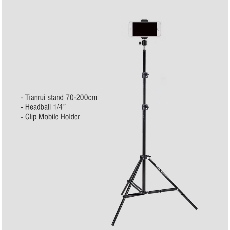 Bộ chân giữ máy ảnh hỗ trợ quay phim, chụp ảnh bao gồm:- Chân đèn Tianrui 70-200cm (Min-Max)