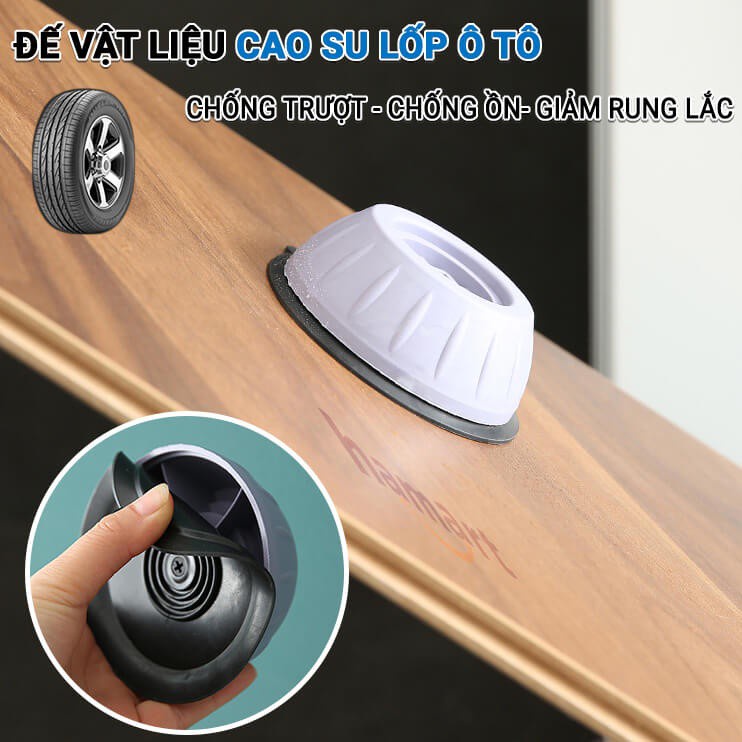 Công dụng: sản phẩm được làm từ vật liệu cao su tổng hợp đặc biệt chống rung lắc, giúp giảm thiểu tiếng ồn hiệu quả cho máy sấy, máy giặt khi động cơ hoạt động. Vừa là chân năng đỡ các sản phẩm gia dụng hiệu quả, giúp công đoạn vệ sinh điểm khuất trở lên dễ dàng và thuận tiện. Giảm thiểu hiệu quả tiếng ồn tác đụng trực tiếp đến sàn nhà do được làm từ vật liệu cao su có tính đàn hồ