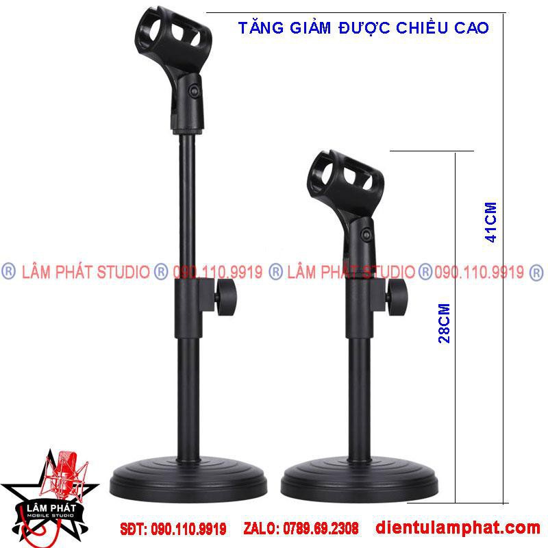 Chân micro để bàn có chiều cao có thể thay đổi linh hoạt trong khoảng từ 28-41cmTrục ống có chiều dày 1.3cm vô cùng chắc chắn, đế đúc gang nguyên chất tạo độ vững chãi cho mọi micro để bàn.