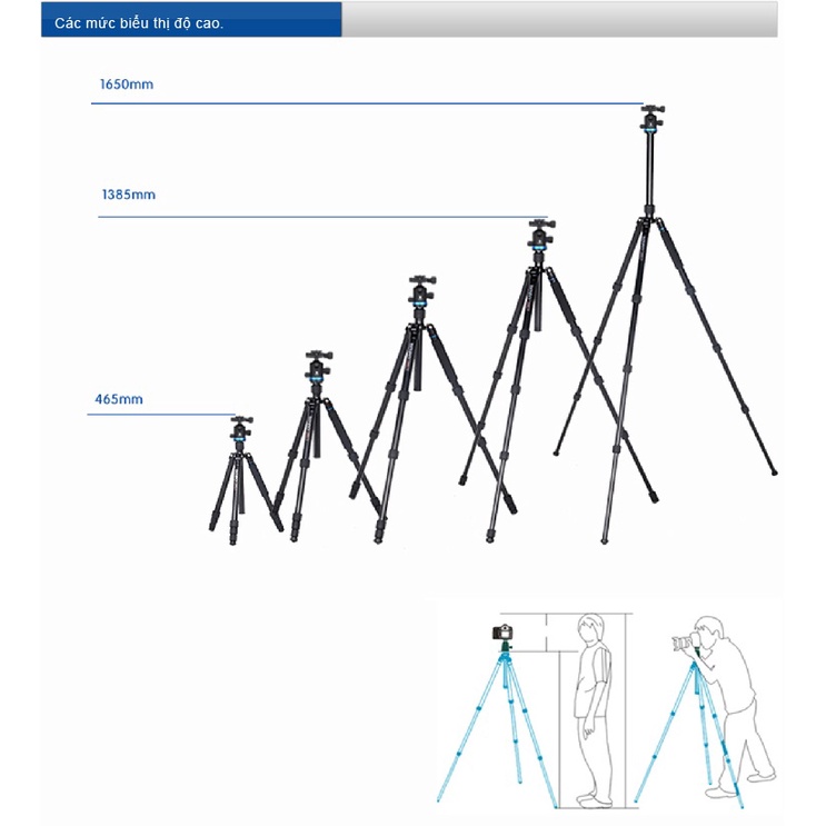 - Chân máy có khả năng chịu tải là 22 lb - Chân máy có thể đạt đến chiều cao tối đa là 65 "