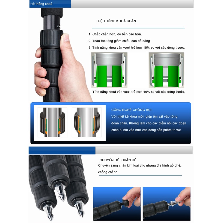 - Giá ba chân có một chân có thể tháo rời, trở thành một chân đơn và có thể được đưa đến những khu vực không được phép hoặc không vừa với giá ba chân