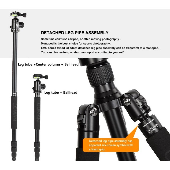 1. Một chân và cột trung tâm chuyển thành monopod. Cột trung tâm có thể được gắn vào để tăng chiều cao