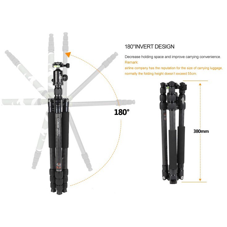 COMAN TM257CC0, TRIPOD SỢI CARBON Chân máyCOMAN của Dòng EMU là giá đỡ cho chất lượng và chức năng cao nhất. Coman TM257CC0 là người bạn đồng hành hoàn hảo khi đi du lịch vì nó có chân có thể gập lại 180 độ, kích thước gói hàng tương đối nhỏ và trọng lượng chỉ 1480g. Nó có một mức tinh thần được xây dựng sẵn để máy ảnh dễ dàng căn chỉnh.