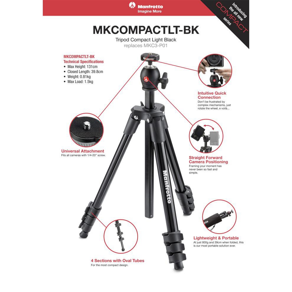Chân máy ảnh Manfrotto Compact Light được thiết kế dành cho các dòng máy ảnh DSLR với ống kính tiêu chuẩn, với chiều cao tối lên tới 131cm, sức tải 1,5kg, gọn nhẹ phù hợp với các chuyến du lịch của bạn.