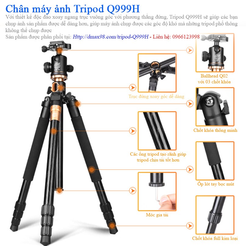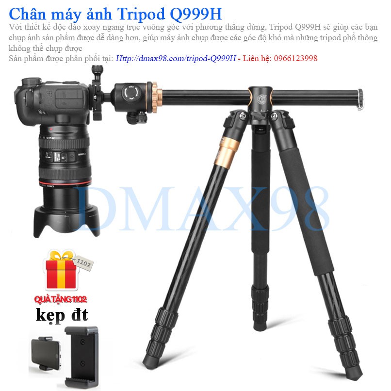 Chân máy ảnh Tripod Q999H bản trục đứng vuông gócQuý khách sử dụng điện thoại hoặc những máy ảnh Compact có thể chọn mua phân loại Q222H với giá thành rẻ hơn, tiết kiệm chi phí mà vẫn có hiệu năng và thanh ngang tương tự chân Q999H