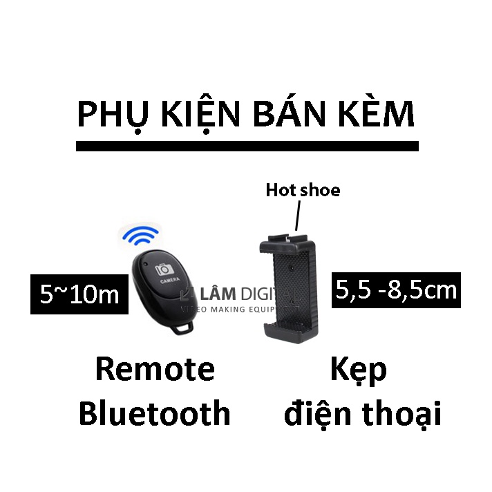 - Dùng cho máy ảnh DSLR, mirroless, máy ảnh du lịch, máy quay phim, điện thoại… Tải trọng lên tới 3KG.- Khách hàng dùng với điện thoại cần mua thêm kẹp điện thoại và remote bluetooth (nếu cần)