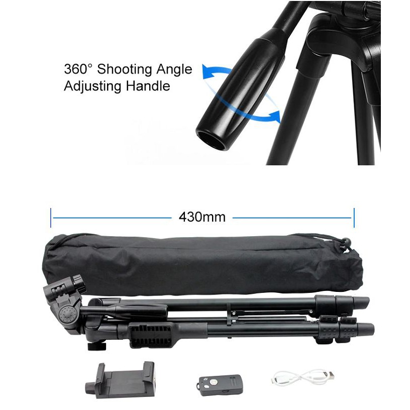 Chân máy ảnh tripod Yunteng VCT-5208 với màn trập điều khiển từ xa Bluetooth cho điện thoại di động, máy ảnh DSLR và máy ảnh thể thao. Chân máy, hợp kim nhôm chất lượng cao và được lựa chọn qua xử lý bề mặt đặc biệt, được sản xuất qua quá trình kiểm tra nghiêm ngặt, nhẹ và chắc chắn và dễ mang theo. Có khả năng thích nghi với môi trường phức tạp thô sơ của địa hình.THÔNG SỐ KỸ THUẬT: