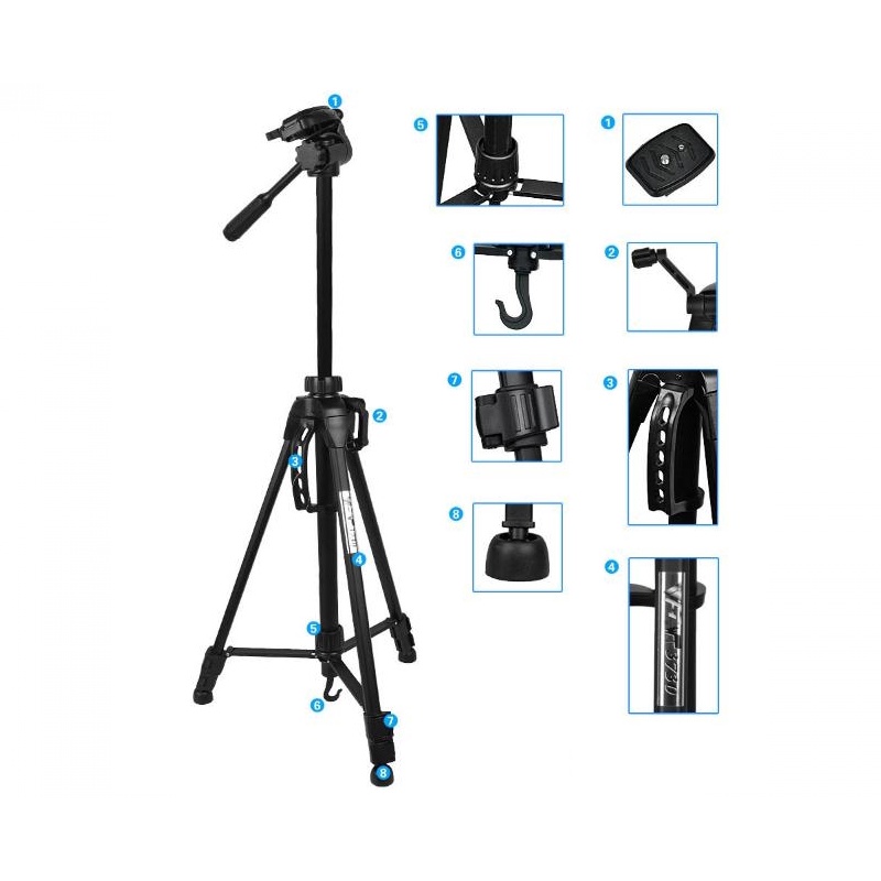 Chân máy ảnh Weifeng WT3730Chất liệu: hợp kim nhôm, gọn nhẹ giúp bạn dễ dàng mang theo.