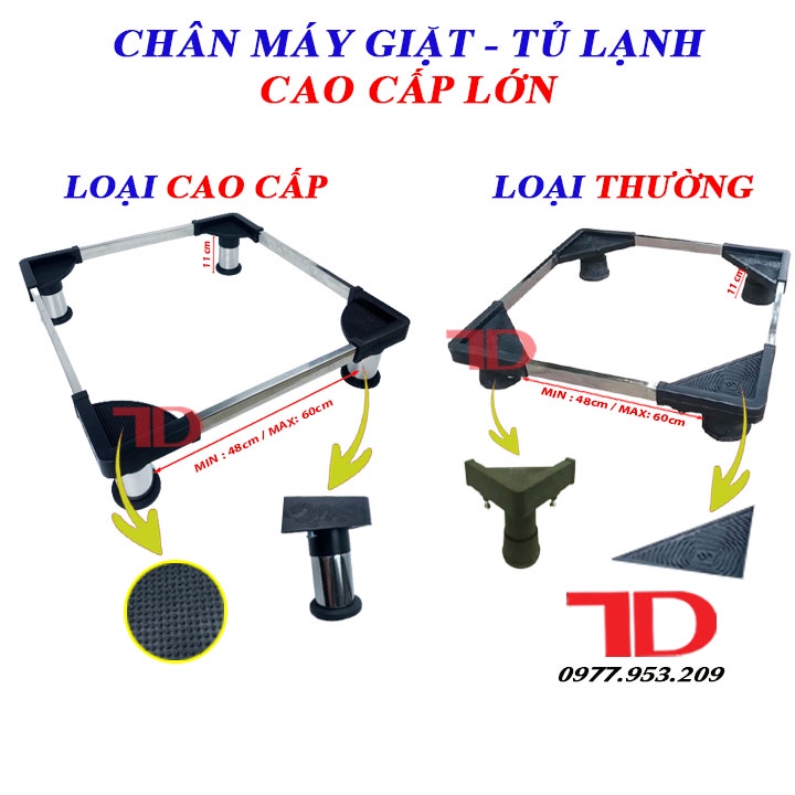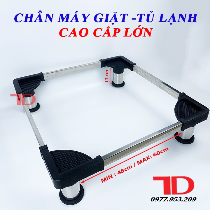 - Chân máy giặt tủ lạnh đa năng có thể thay đổi được cả chiều dài và chiều rộng từ 48 cm - 60 cm tùy chỉnh theo kích thước máy giặt, tủ lạnh.