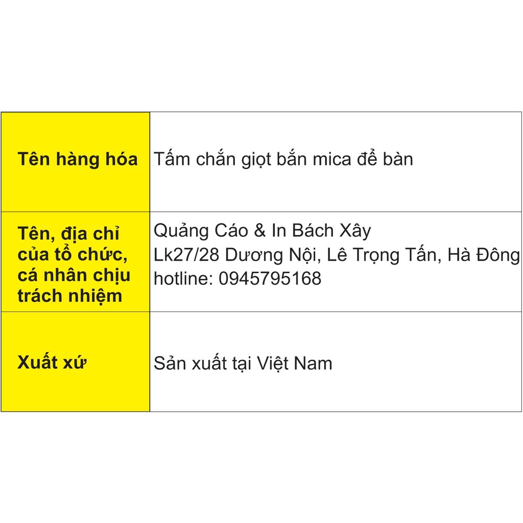 - Chất liệu: tấm chắn mica trong 3mm cứng cáp, an toàn, dễ sử dụng, không vỡ như kính