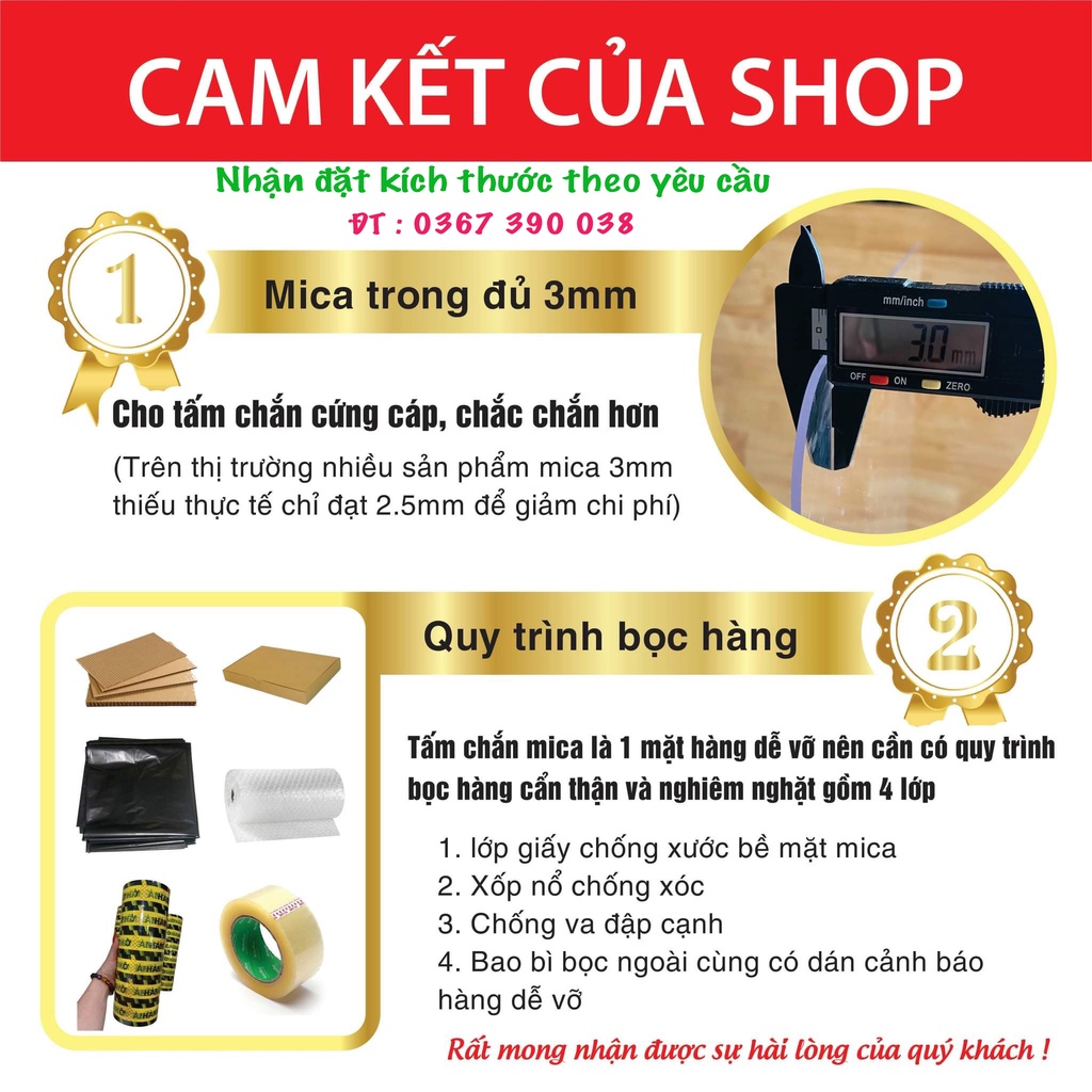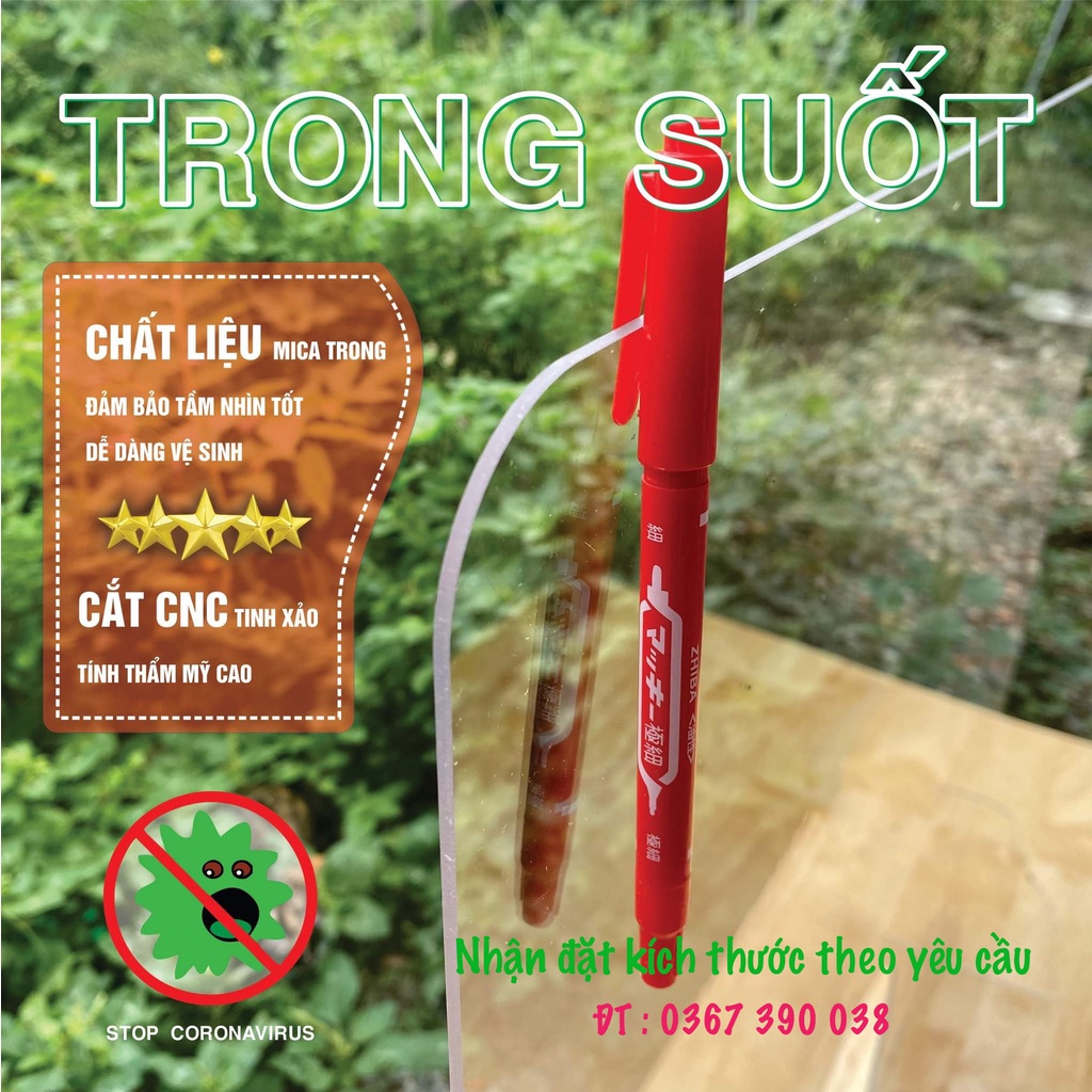 - Chất liệu mica 3mm trong suốt cứng cáp, an toàn, dễ sử dụng, không vỡ như kính