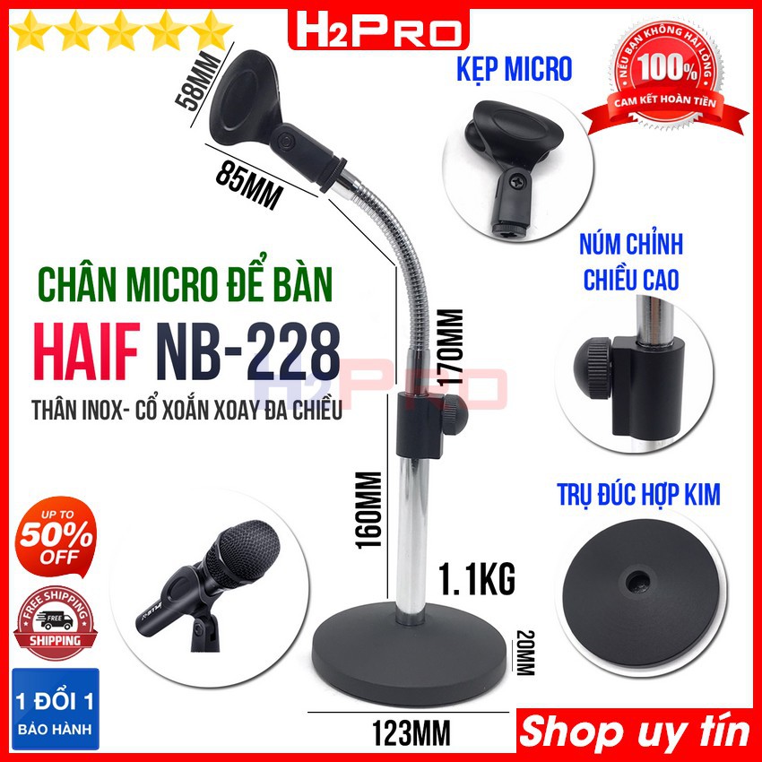 Chân micro đứng để bàn HAIF NB228 H2Pro chính hãng cao 30cm thân inox-cổ xoắn đa chiều, chân gắn micro đứng để bàn