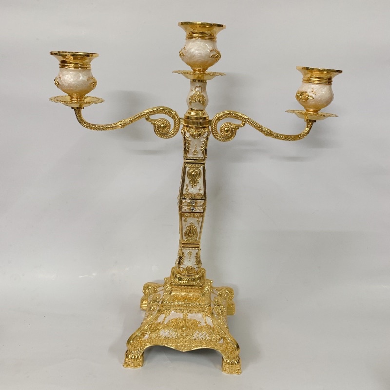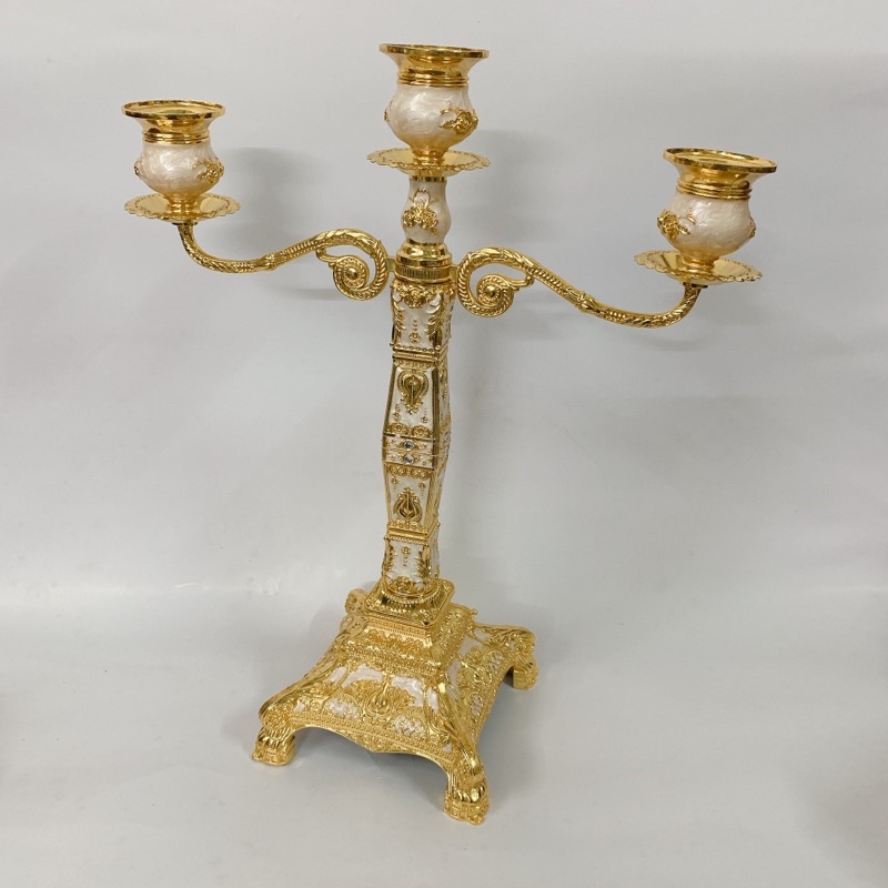 Chân nến 3 tay mạ mầu vàng hoa văn sang trọng Huydecor
