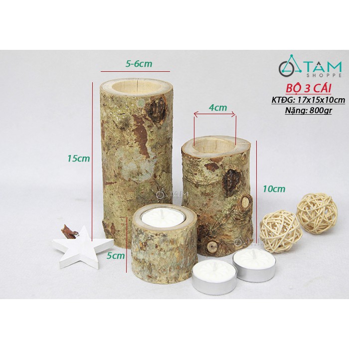 - Mô tả: 1 bộ gồm 3 cái chiều cao lần lượt 5-10-15cm. Để vừa viên nến tealight. Tùy theo đợt loại gỗ khác nhau mà vỏ bên ngoài khác nhau. Trước khi đặt hàng, nhân viên sẽ xác nhận hình ảnh mẫu hiện có để khách quyết định nha...
