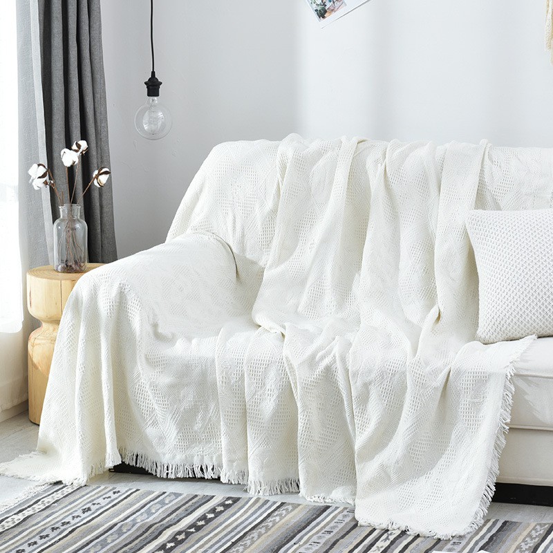 Sự kết hợp giữa màu trắng cổ điển, chất liêu bông dệt kim khi sờ vào khiến bạn cảm thấy vô cùng mềm mịn, thoải mái.Sản phẩm có thể sử dụng với nhiều công dụng khác nhau như làm khăn sofa, thảm trải sàn, khăn trải bàn, chăn đắp... Và dù dùng cho mục đích nào đi chăng nữa cũng khiến bạn thấy dễ chịu, vừa thoáng khí nhưng cũng vô cùng ấm áp.