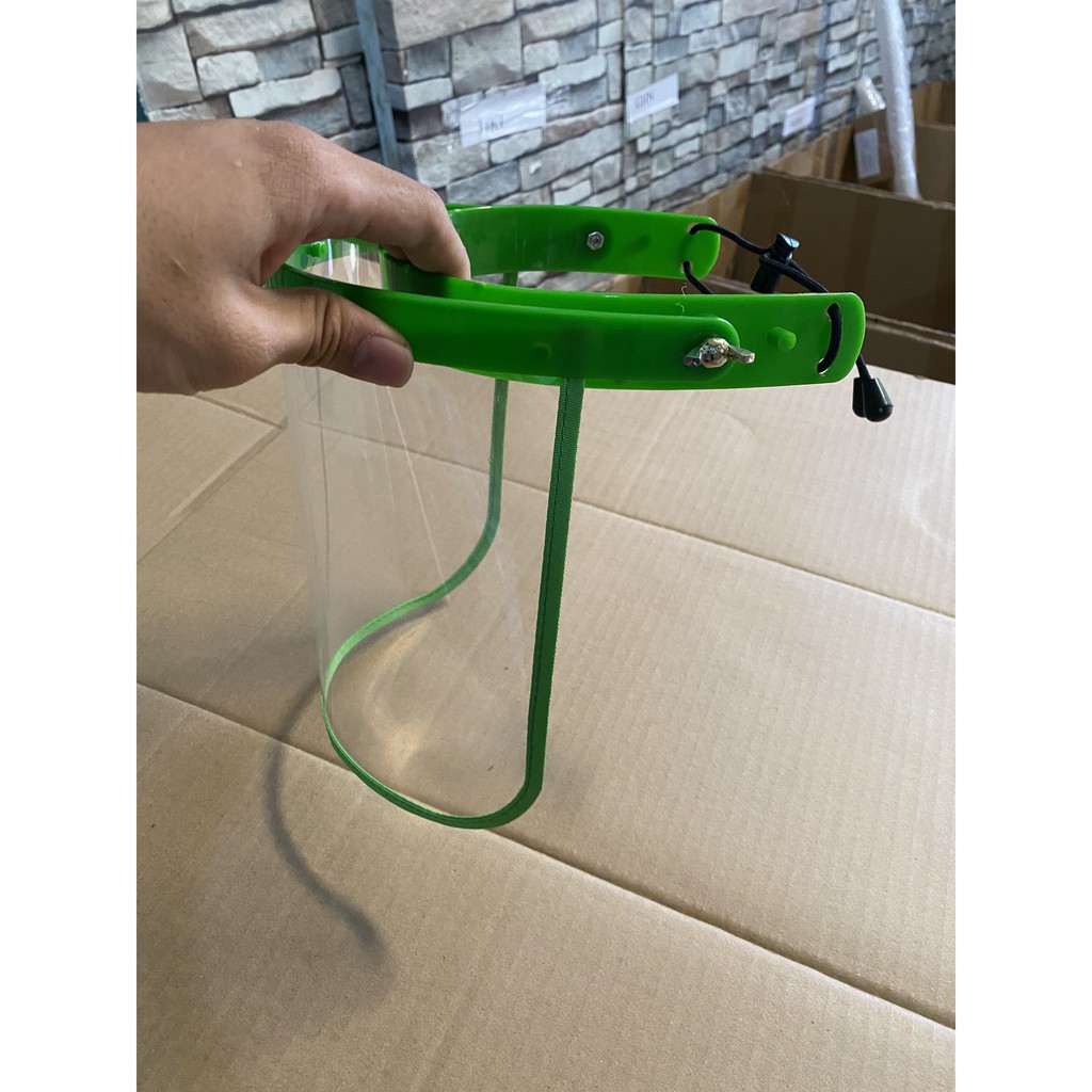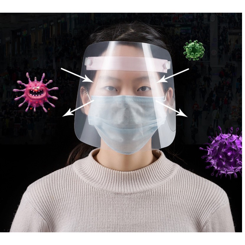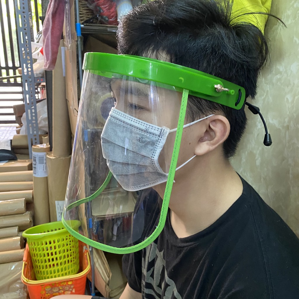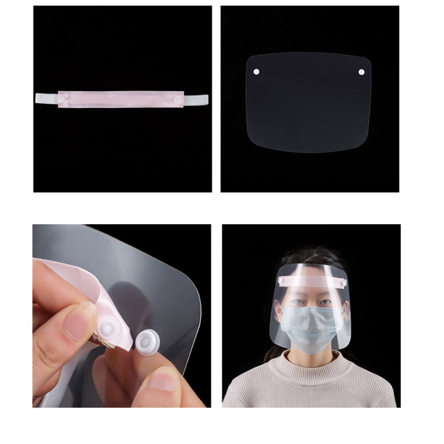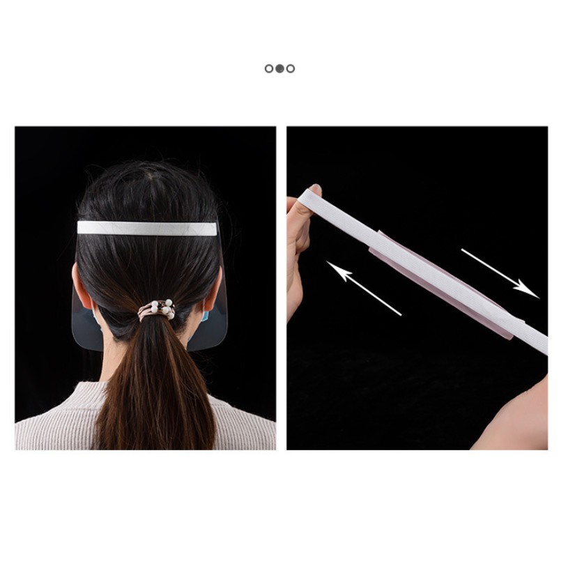 ** Tấm chắn trong suốt chất liệu nhựa, nhẹ, trong giúp bạn nhìn rõ mọi vật.** Tấm chắn được giữ cố định bởi dây thun co giãn quanh đầu