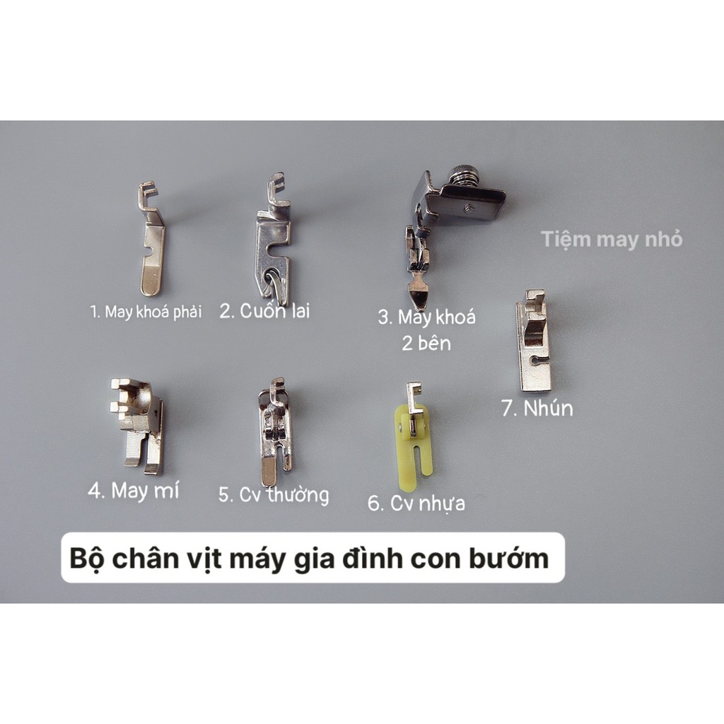 Bộ chân vịt dành cho máy gia đình con bướm bao gồm:1. Chân vịt may khóa phải